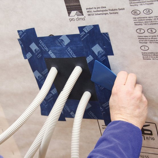 ROFLEX is a series of sealing grommets ideally suited for quick and permanent airtight sealing of penetrations of pipes. They are made of strong and flexible EPDM and can be used inside to seal penetrations through the airtightness layer as well as outside for penetrations in the roof and wall underlays. Pipes can be pulled and pushed without damaging the airtightness layer.