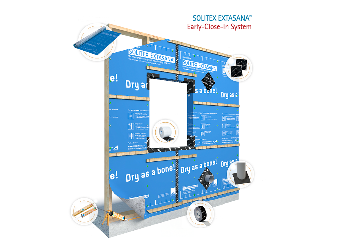 Pro Clima Early-Close-In allows interior work to begin before cladding installation, maintaining speed and safety on site. The system uses SOLITEX EXTASANA® — a single-layer wall underlay providing up to 180 days UV protection.